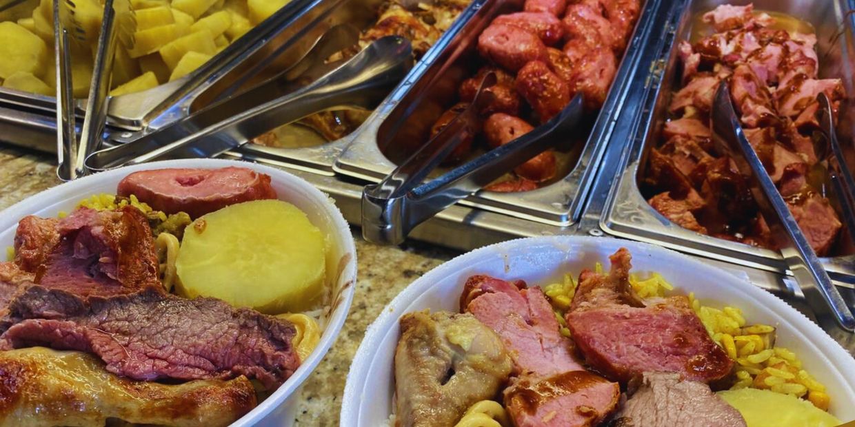 O cardápio das marmitas muda todas os dias, cada dia com delícias diferentes e contém: prato principal, salada e 4 opções de carne assada.